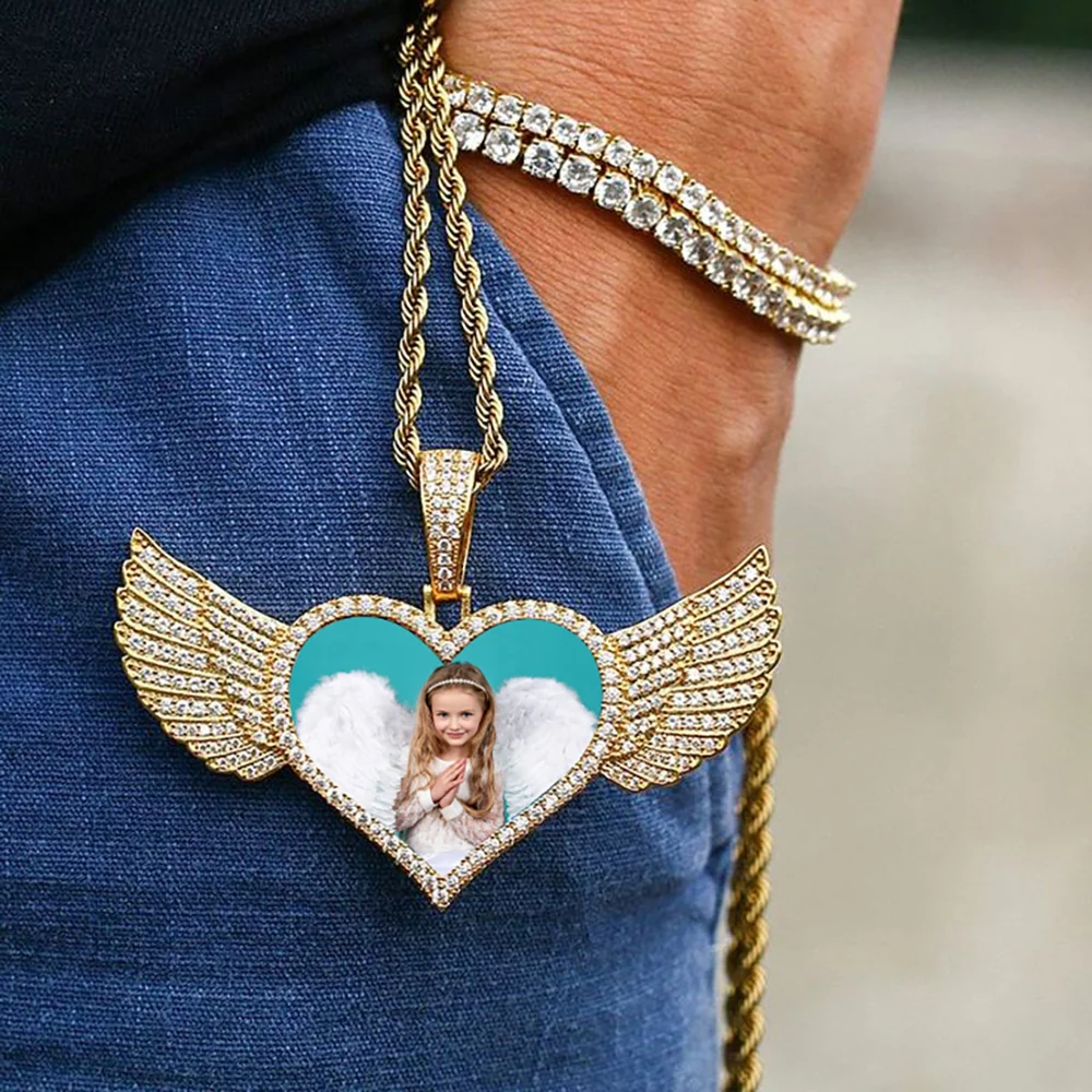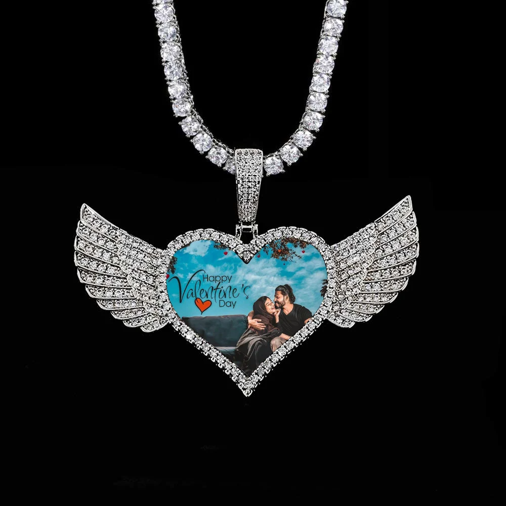 Customized Heart Photo Necklace Men and Women Hip Hop Personalized Wing heart Picture Pendant Iced Charm Free Custom Logo