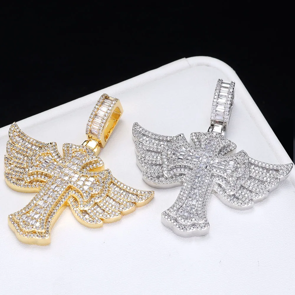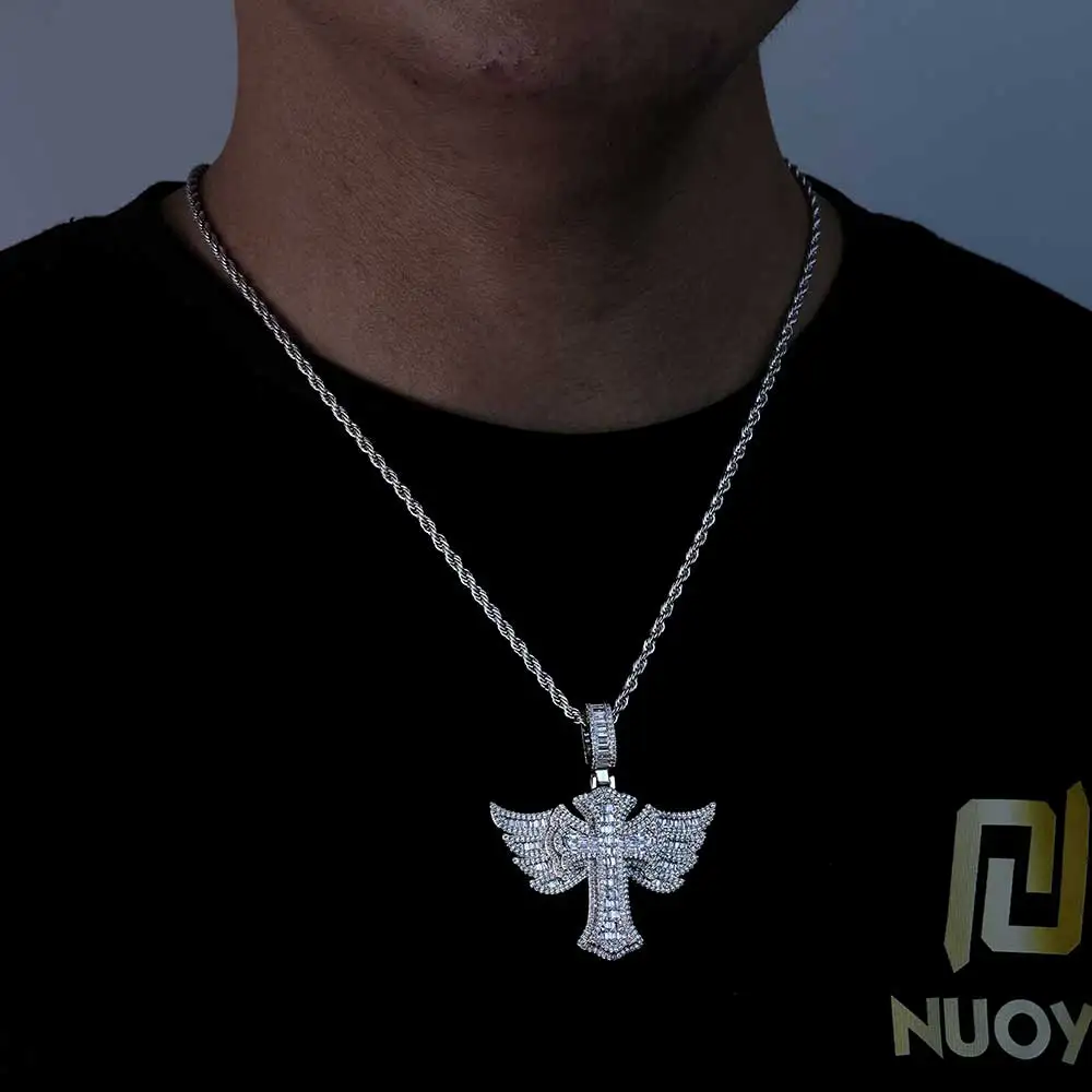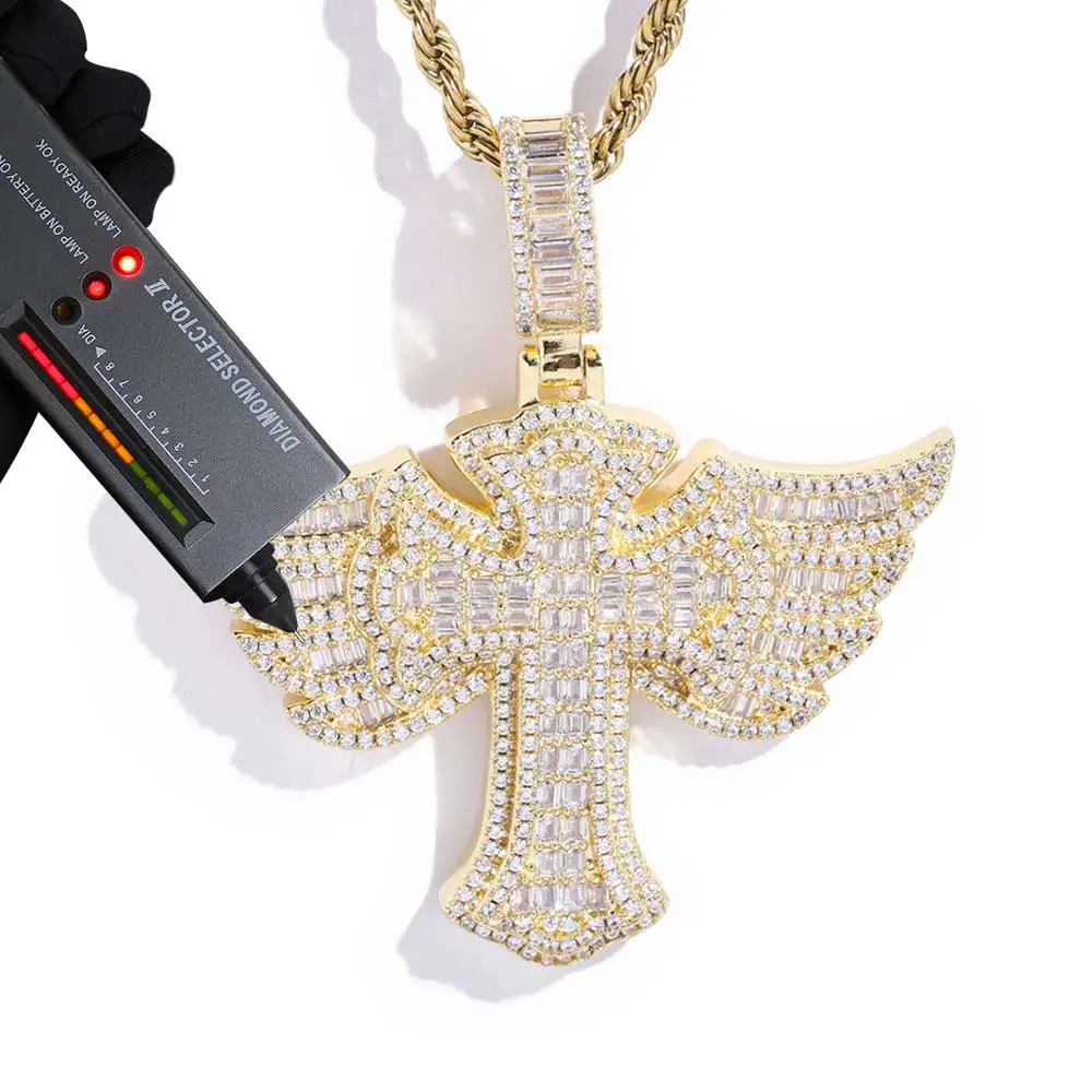 New 925 Sterling Silver Wings Cross Pendant Inlaid With VVS Moissanite Diamond Popular Hip-hop Cross Necklace Jewelry